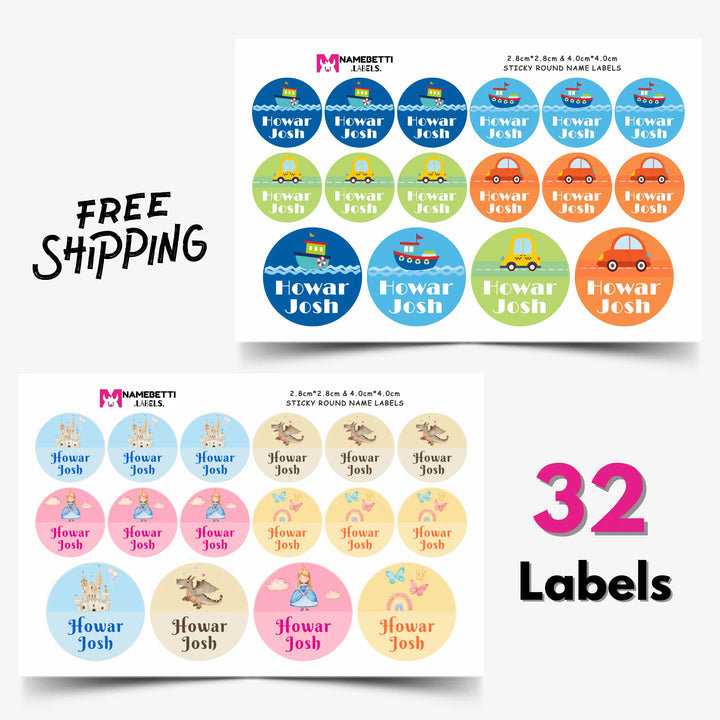 The NameBetti Round Sticky Name Labels contains 32 name labels including: